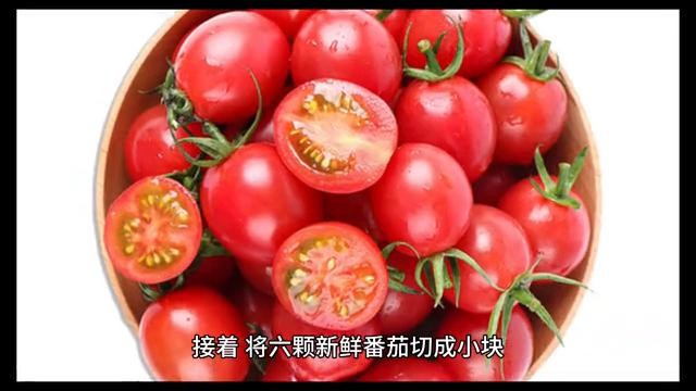 ·接着将六颗新鲜番茄切成小块,放入热水中焯水捞出沥干备用。
