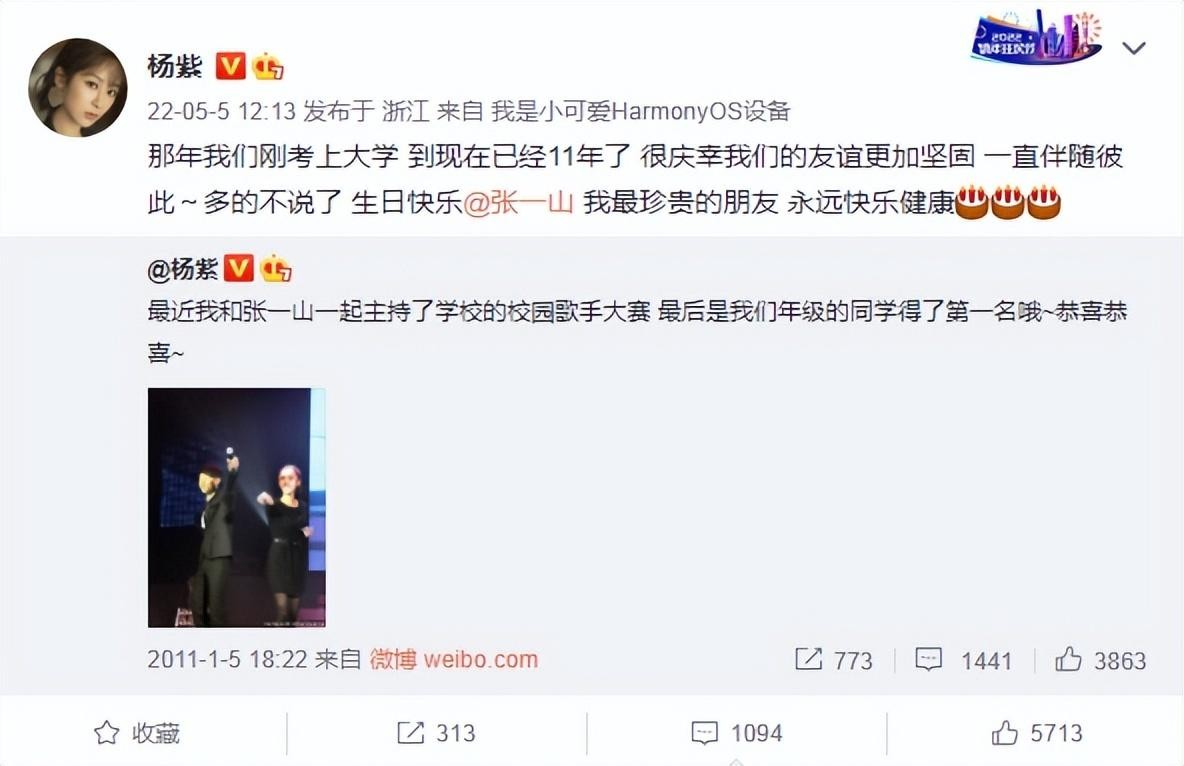5月5日是张一山的生日,作为多年好友,杨紫考古出11年他们刚上大学一起主持校园歌手大赛时的微博为张一山庆生。