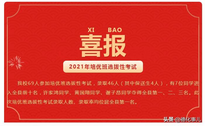 喜报称,德化三中69人参加培优班选拔性考试,录取46人(其中保送生4人),有7位同学进入全县前十名,许家鸿同学、黄国翔同学、谢子昂同学夺得全县第一、二、三名。此次培优班选拔性考试录取人数、录取率均位居全县第一名。