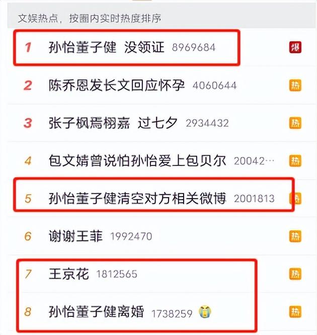 两人离婚的消息很快霸榜娱乐榜,有趣的是,榜上却是一个董子健和两位“妈”,一位是董子健口中的孩子他妈孙怡,还有一位则是他的亲妈,王京花。