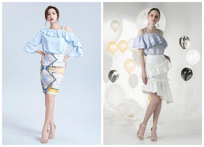 浅蓝色的荷叶边一字肩上衣可以搭配一件几何图形的半身裙,穿一双高跟凉鞋,造型知性优雅!同理也可以搭配白色荷叶边半身裙,白色+蓝色的组合,干净清新!▼