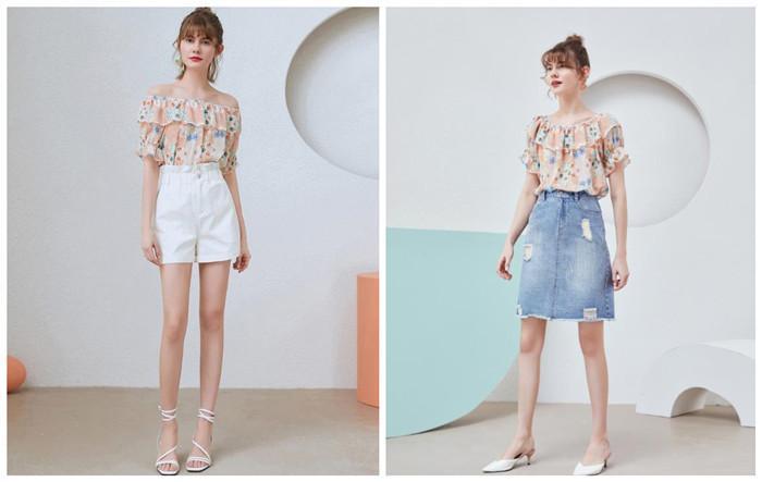 除了元气十足的颜色之外,碎花点缀的一字肩上衣也非常青春活泼,荷叶边+灯笼袖的小细节设计让女生的甜美度上升。这样的碎花一字肩上衣,真的非常符合夏天美丽的主题。