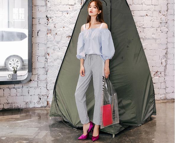 除了条纹元素能给人一种知性风之外,浅色系也能给人营造一种干净简约的知性感。比如浅蓝色的一字肩上衣,就能满足知性风格的女生。