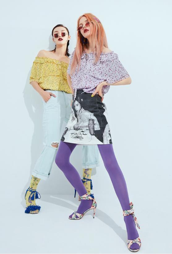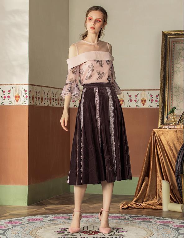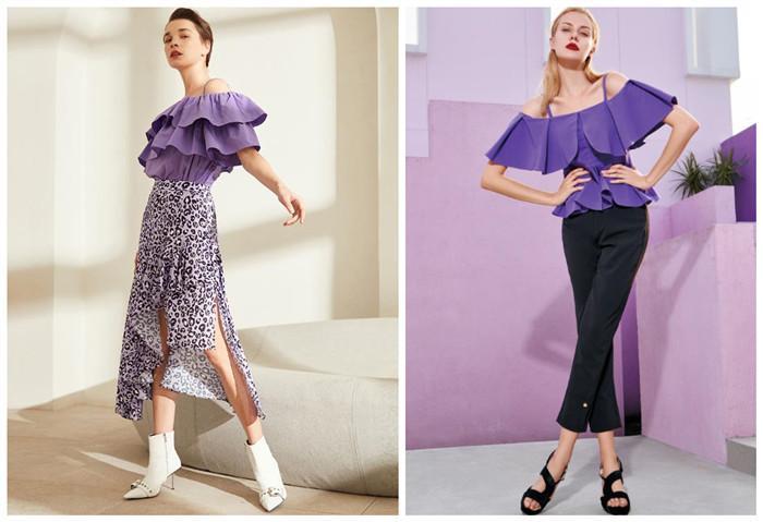 紫色自身的一字肩上衣,搭配不规则的碎花半身裙就尤为适合了。不喜欢搭配裙子的,那么搭配一件黑色九分裤也非常优雅复古。▼