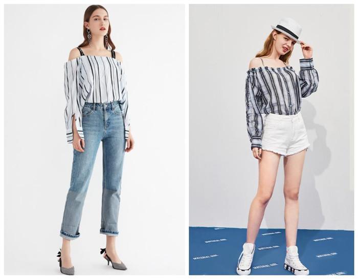 黑白条纹一字肩上衣,可以选择和蓝色牛仔长裤或者白色牛仔短裤进行组合搭配。搭配蓝色牛仔长裤,造型知性干净,搭配白色牛仔短裤,知性减龄!穿高跟鞋或者帆布鞋都适合!▼