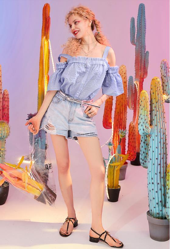 夏天真的是一个好季节,有着鲜花和蓝天白云的相衬,让盛夏多了几分惬意感。那么这样惬意的夏天,也需要一款漂亮百搭的一字肩上衣来配合了。