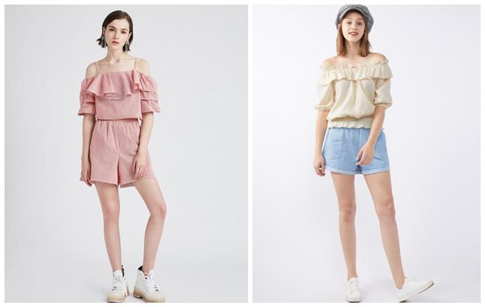 喜欢清凉穿着的女生,可以搭配短款裤子就非常好看,青春活力的女生穿起来就非常青春减龄。如果你是穿一款粉色荷叶边一字肩上衣,下身可以搭配一款同色系粉色的短裤,造型清爽舒适!