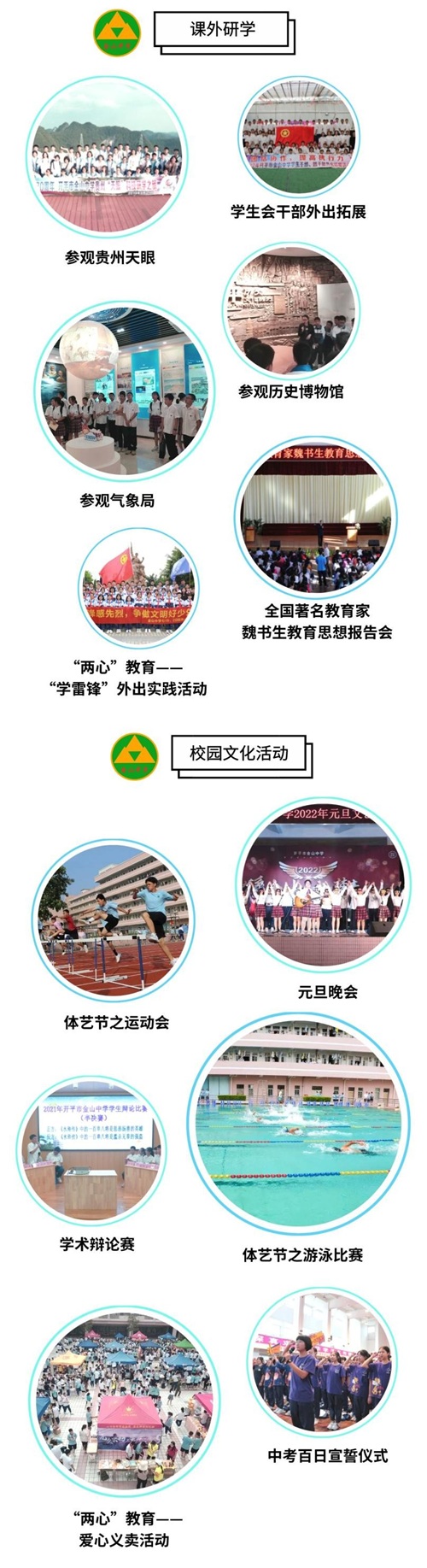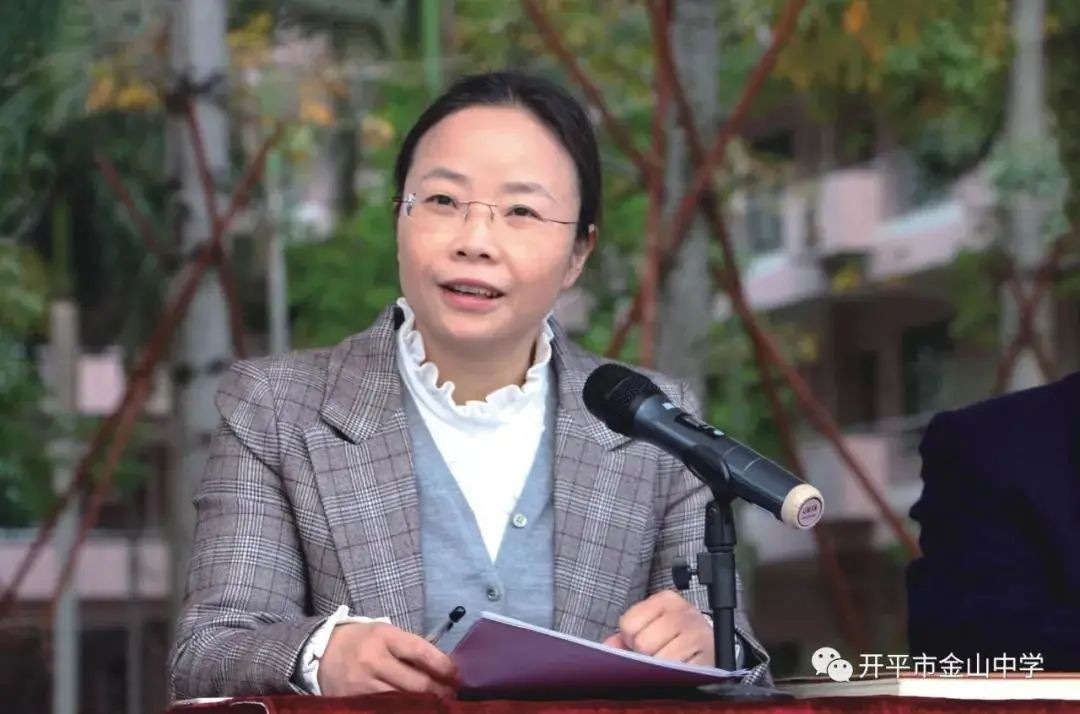 开平市金山中学是1999年由广东泰和集团董事长吴耀汉先生投资1.7亿元兴建的一所全寄宿的民办公助初中。校长郑娟馥是教育部国培专家、数学正高级教师、广东省特级教师、广东省名校长工作室主持人。开平市金山中学学生2700多人,专职教师200多人,员工100人。校园占地100亩,美丽如画,是全国民办教育先进集体、广东省首届“十佳”民办学校、广东省一级学校、广东省文明单位。开平市金山中学地处珠三角,有高铁站开平南站,50分钟即可抵达广州。开平市是建筑艺术之乡、华侨之乡,常住人口70万,海外侨胞75万。开平人大气包容的优秀品格吸引了各地优秀的人才前来就业。