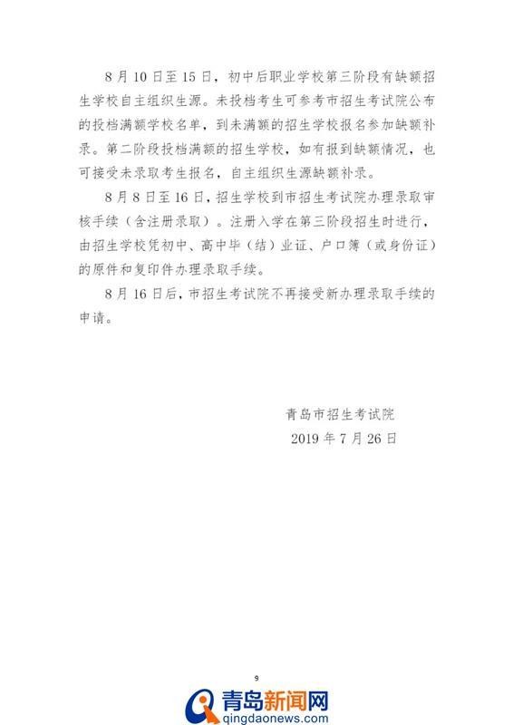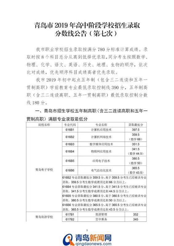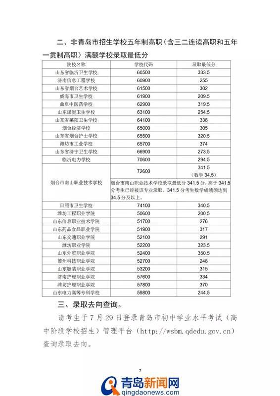 青岛新闻网7月26日讯(记者 于泓)今天上午,青岛市招考院发布第七次2025青岛高中阶段录取分数线,其中初中起点五年制学前教育专业最低录取控制线390分,五年制高职最低录取控制线180分,具体分数线如下: