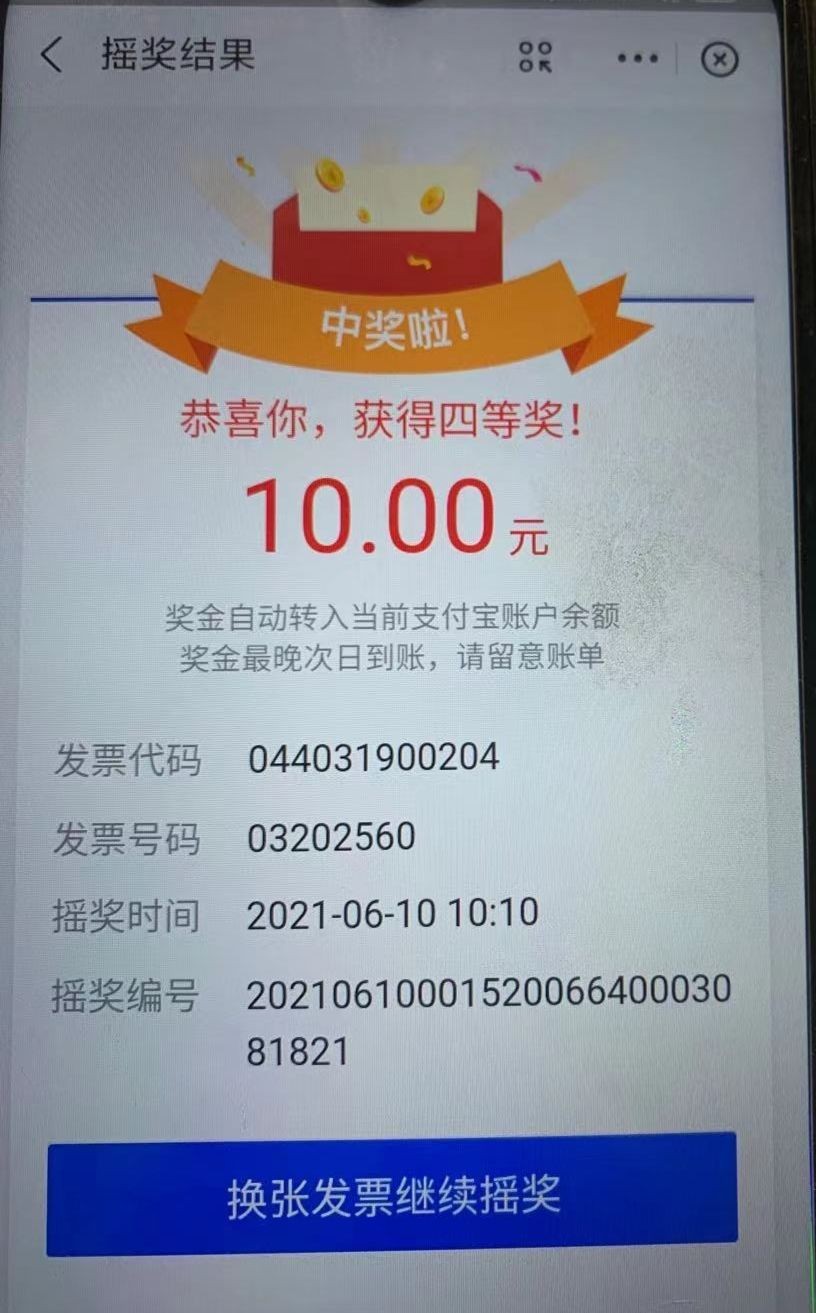 近日,一位财务朋友突然告诉我自己在支付宝的【发票摇奖】中扫发票中奖了,有图为证。但是这个【发票摇奖】还是有许多限制条件的,具体参照自己地区的标准。比如发票抬头只能是个人的普通发票、面值不得低于20块钱(有的地区可能不一样)、还有地域等限制,虽然有挺多限制,但是符合条件的不妨试试。