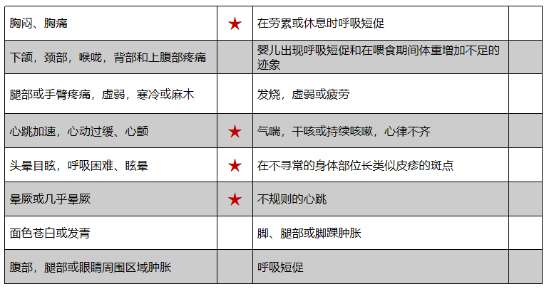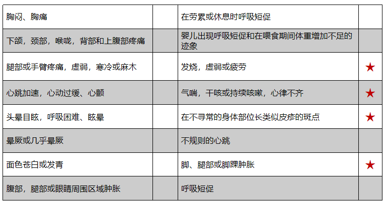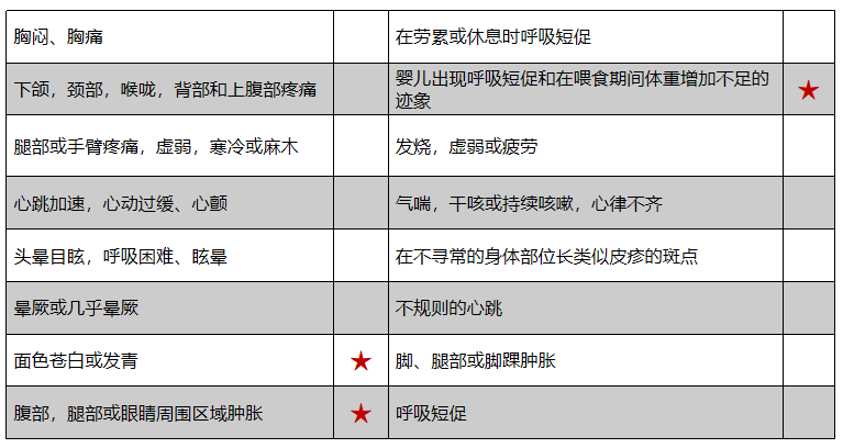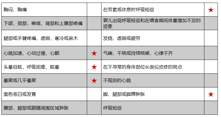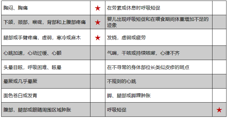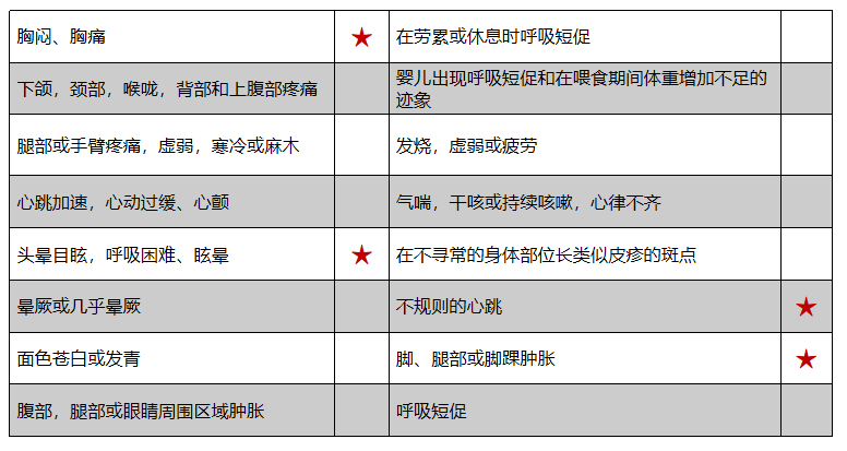 严重的先天性心脏缺陷在出生后很快就会发现,也可能导致心血管疾病。 在心脏病发作之前,这些缺陷患儿表现出的症状包括: