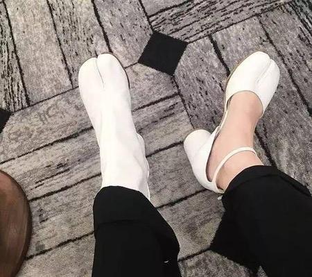 从日本Tabi 得来的灵感—— 分趾鞋。 Martin Margiela为时装界贡献了不少具有原创性和符号意义的设计,tabi几乎已经成了品牌同义词。tabi式的运动鞋竟然出奇的好看,虽然tabi鞋并没有特别的热门,但是他在各潮人脚上得到了非常多的演绎,记得一定要备好五趾袜。